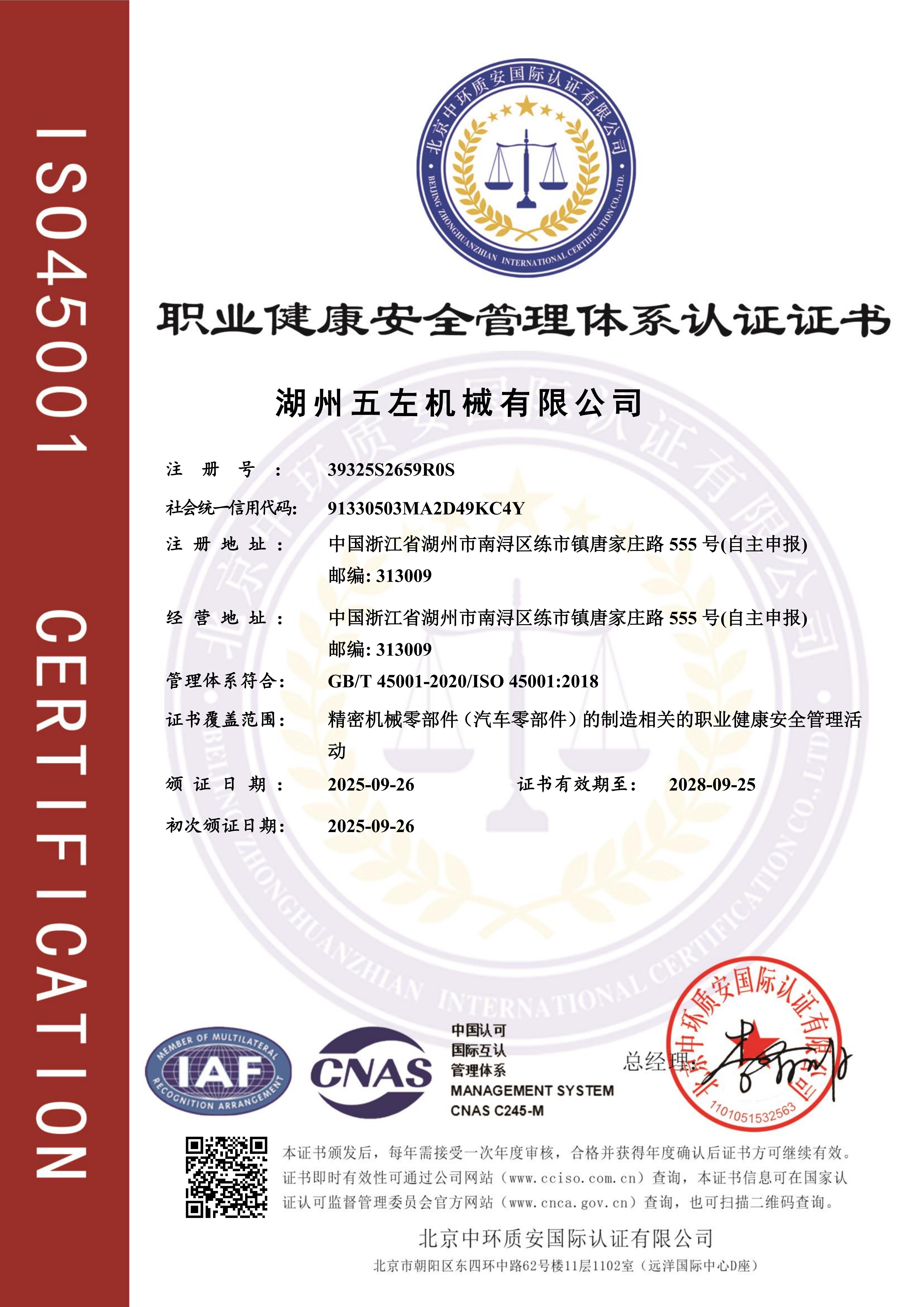 2025年9月26日通过ISO14001环境管理体系和ISO45001职业健康管理体系认证。